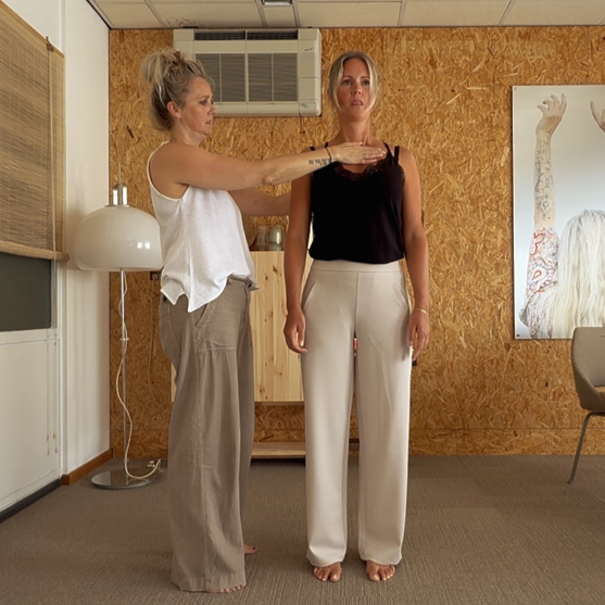 Vervolgens doen we een eerste lichaamsobservatie: ik kijk naar je houding, ademhaling en spanning in je ruggenwervel. Je blijft daarbij volledig gekleed. Ik maak gebruik van eenvoudige tests en aanraking om te voelen wat jouw lichaam vertelt.
